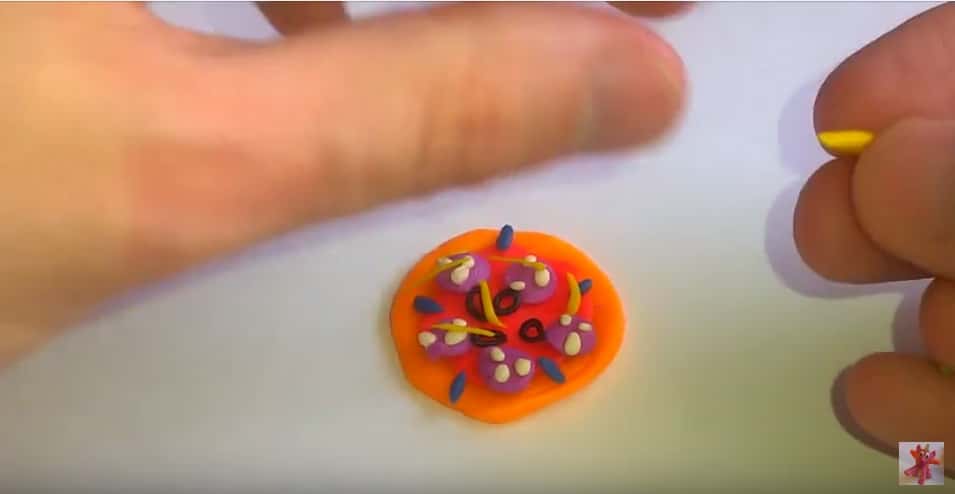 Для начала из оранжевого цвета вылепим приплюснутый круг, который будет выполнять роль основы (теста) для пиццы и положим на него несколько кружков из фиолетовой массы. На каждый кружок положим по несколько маленьких кусочков белого цвета, получив таким образом своеобразные колбаски.