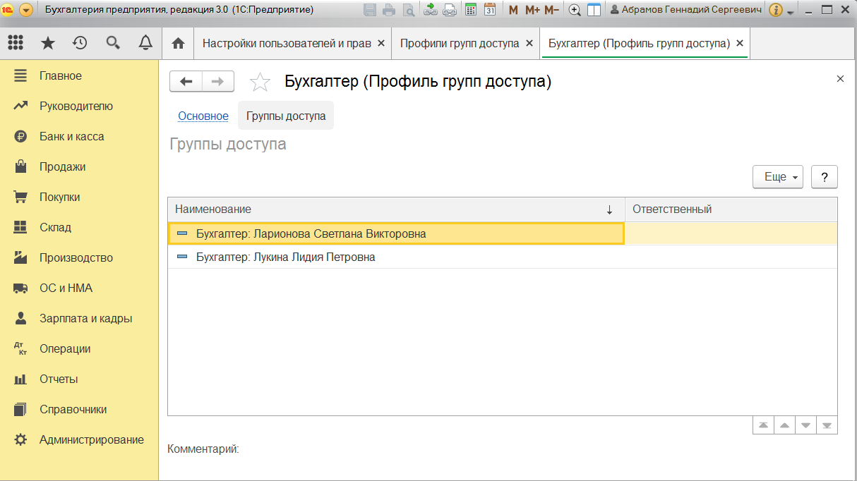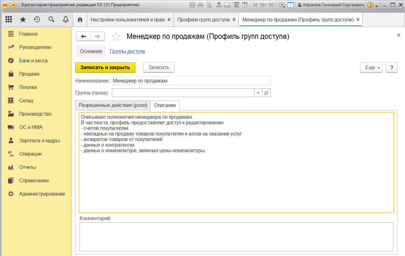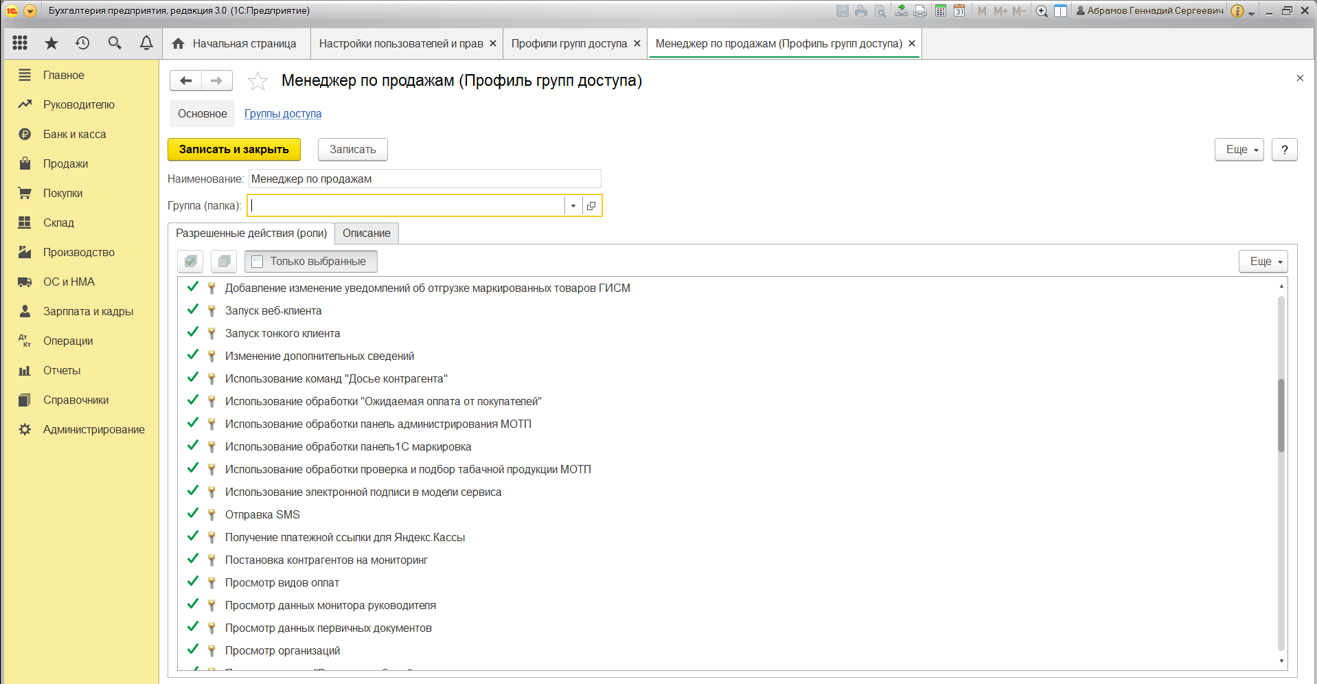 Допустим, что вам необходимо разрешить группе бухгалтеров редактировать реквизиты объектов. Для этого зайдите в раздел «Профиль групп доступа». Установите флажок «редактировать реквизиты объектов».