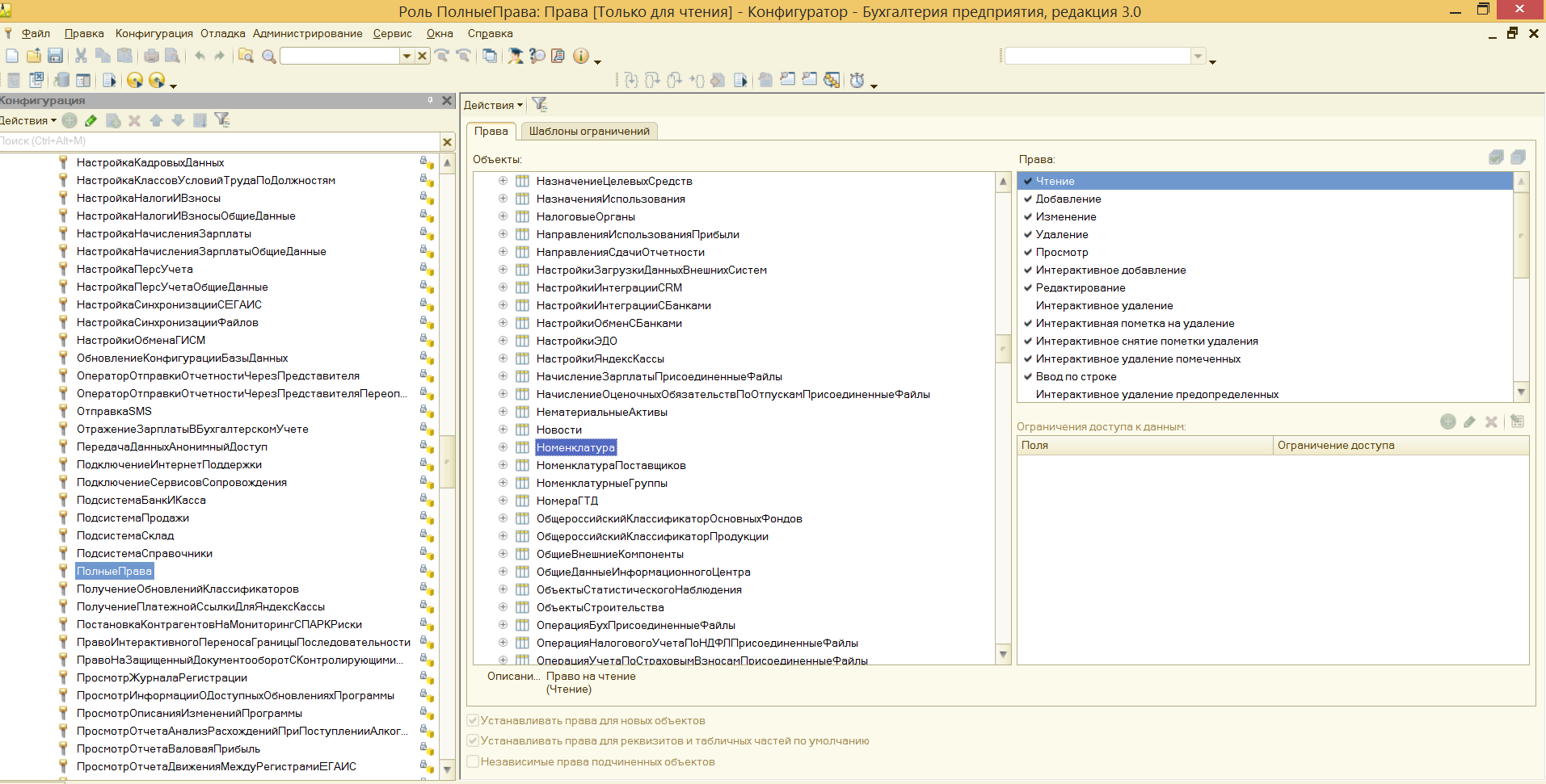 Скажем несколько слов о правах пользователей. Что означает ограничение прав доступа? В разрезе программных продуктов 1С, это запрет на совершение действий с какими-либо файлами и объектами. Например, можно закрыть пользователю доступ для изменения документа, копирования и даже просмотра. Соответственно, расширить права доступа означает дать разрешение на просмотр, изменение документа, копирование, сохранение и т.д.