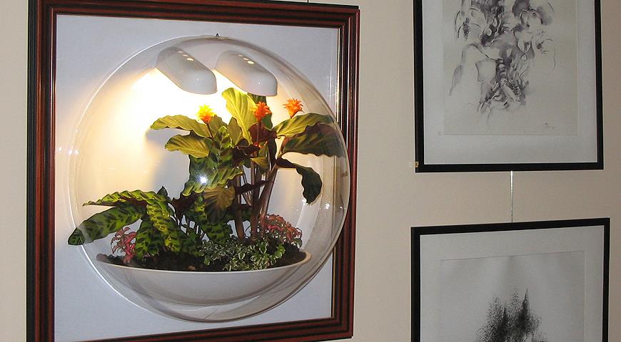сложный вариант флорариумов, так как внутри емкости создается экосистема со своим микроклиматом. После того как растения высажены, емкость плотно закрывается и больше никакого ухода не требуется. Такие миниэкосистемы сложно рассчитать правильно, и, как правило, они недолговечны.