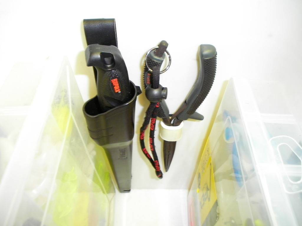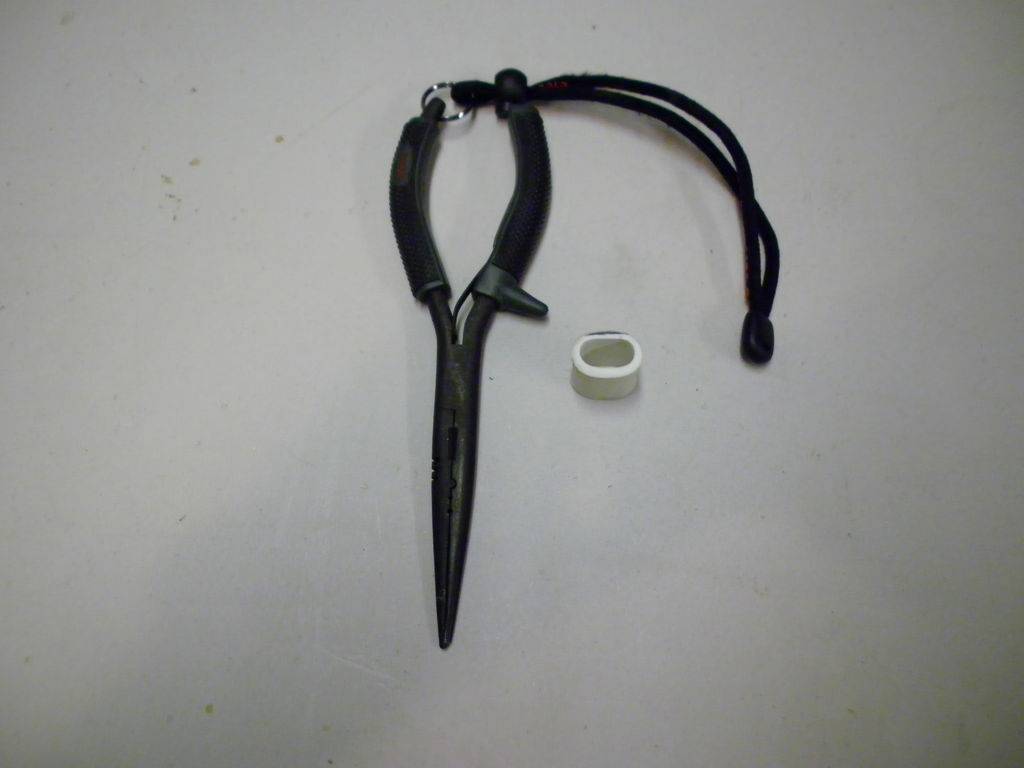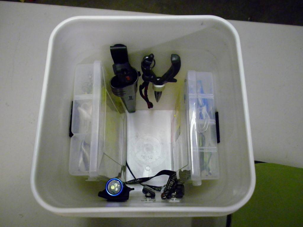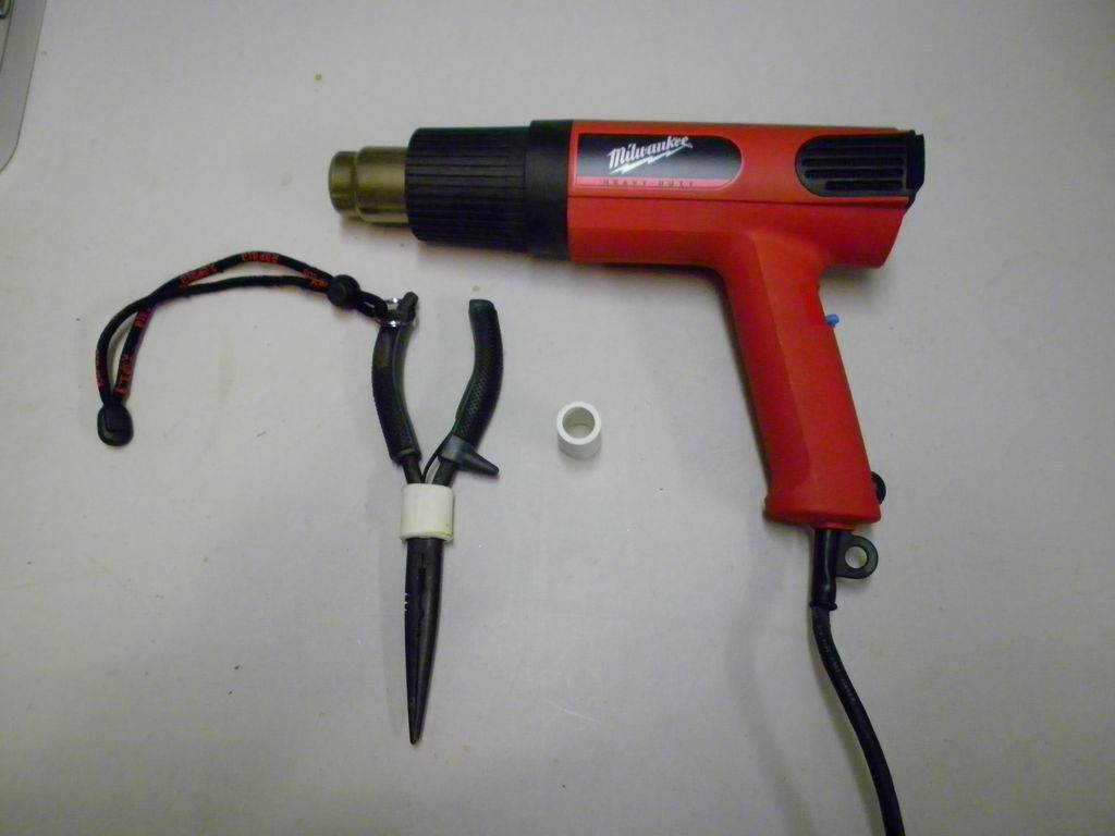 Для плоскогубцев я сделал держатель из куска водопроводной трубы. Я использовал тепловую пушку и подплавил ПВХ по форме вокруг плоскогубцев. Это придало держателю плоскую поверхность на обратной стороне и дало возможность прикрепить его к ведру. Я не хотел сверлить в ведре отверстия, потому что хотел оставить возможность его использования в качестве колодца для рыбы, при необходимости. Я использовал одну из липучек-точек, чтобы прикрепить держатель к боковой части ведра и поместил плоскогубцы в держатель.