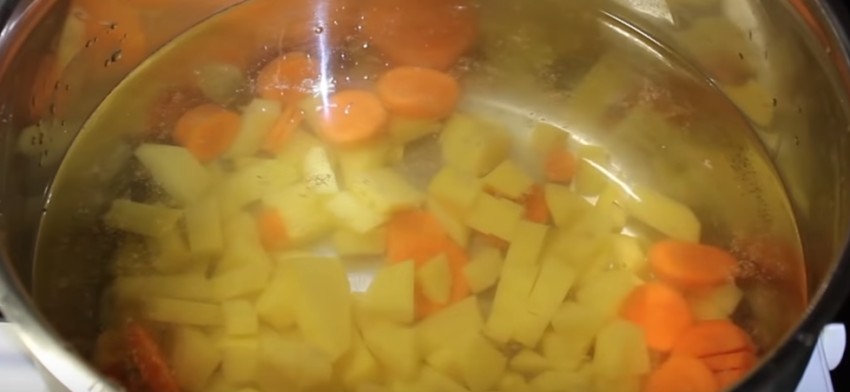 1. Мелкими кубиками нарежьте картофель, морковку – кружками. Залейте овощи водой и поставьте вариться.