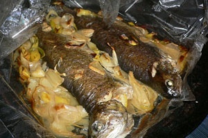 - Выложить щук на луковую массу и завернуть фольгу так, чтобы пар не смог выходить изнутри.