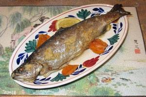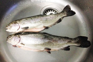 Для начала выбираем рыбку, в принципе, подойдет любая, бескостная либо с косточками, все зависит от вашего желания и возможностей, в моем случае это две небольших форели. Приносим выбранные тушки домой и тщательно промываем под струйками холодной проточной воды, одновременно ножом либо специальным скребком снимая с них чешую в направлении от хвоста к голове. Затем вспарываем каждой рыбке брюшко, потрошим их от внутренностей, снова ополаскиваем, сушим бумажными кухонными полотенцами, со всех боков натираем солью, притрушиваем черным молотым перцем, перемещаем в чистую посуду и оставляем в покое на 15–20 минут.