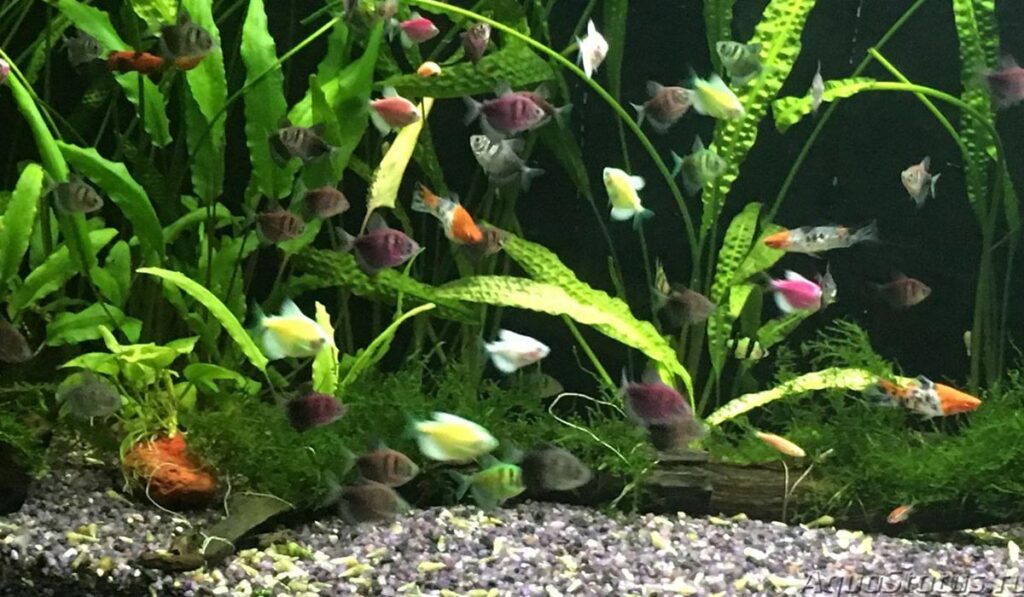 Гуппи – небольшие миролюбивые рыбки, наиболее часто встречающиеся в аквариумах. Тернеции могут проявлять агрессию по отношению к ним, так что для оптимального заселения рекомендуется использовать большой аквариум, обильно засаженный растениями