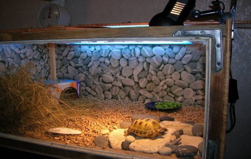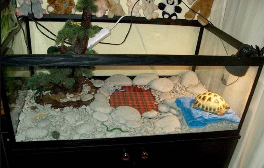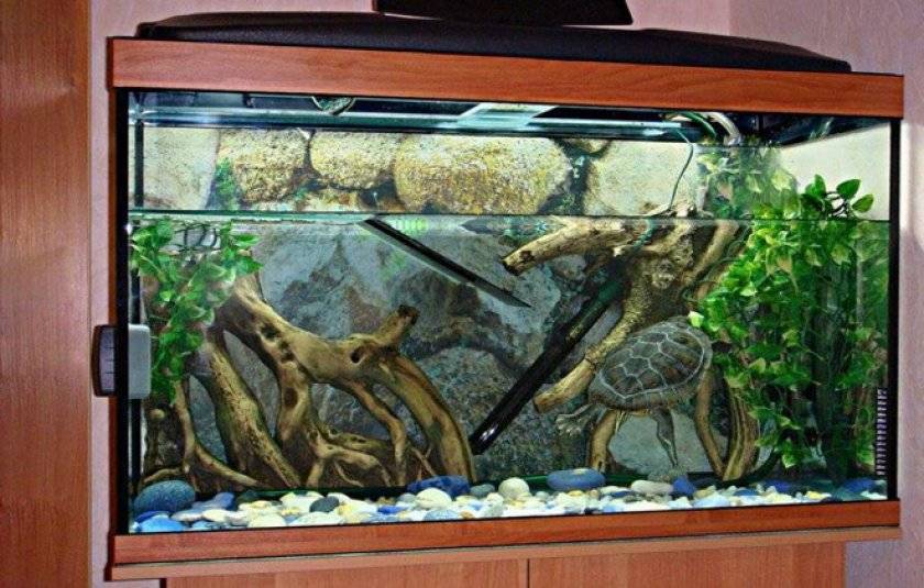 Черепахи хорошо адаптируются к комнатному содержанию в условиях обычного аквариума для водных представителей фауны. В них можно предусмотреть зону для лампового обогрева, а также вентиляционные дыры. Недостатком такого варианта является высокая стоимость конструкции.