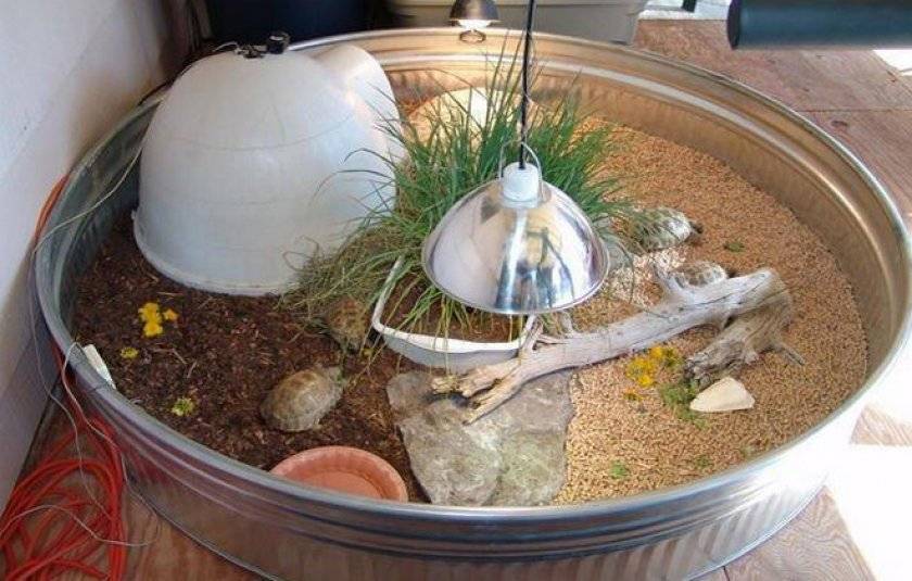 Обустройство террариума для сухопутных черепах предполагает наличие ламп обогрева. Как правило, их бывает две: одна обычная на 60 или 80 Вт, другая ультрафиолетовая, специальная для рептилий. Она позволяет питомцу лучше усваивать кальций, в связи с чем панцирь животного будет ровный, а кости конечностей окрепнут и приобретут правильную форму.