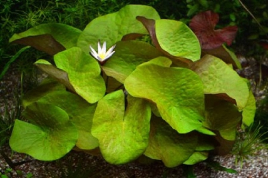 Второе ее название – Тигровый лотос. Была привезена из Африки и быстро распространилась по всему миру. Тигровую кувшинку окультурили еще в древние времена. Египтяне называли ее «белым лотосом». Выделяют зеленую и красную тигровую нимфею. Оба подвида были выведены искусственным путем. Зеленая может вырастать до 60 см в длину. Она совершенно неприхотлива и регулярно цветет. Лист крупный, достигает 15 см, глянцевого насыщенного зеленого цвета, с красными крапинками и полосами. Это растение подойдет для начинающих аквариумистов в силу своей неприхотливости. Нимфея тигровая красная достигает 50 см в диаметре. Она занимает немало места в общем аквариуме, поэтому может содержаться с неприхотливыми растениями, которым не требуется много света. Ее листья имеют насыщенный красный цвет с темными вкраплениями и полосами. Она также регулярно цветет и размножается побегами. Благодаря своему яркому окрасу она способна украсить любой аквариум;
