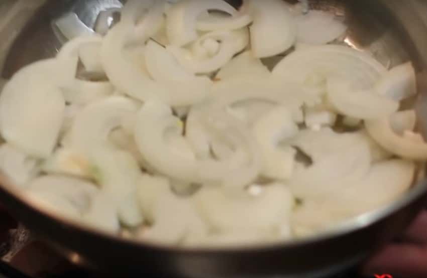 3. В жаропрочную форму налейте масло и на него выложите полукольца лука.
