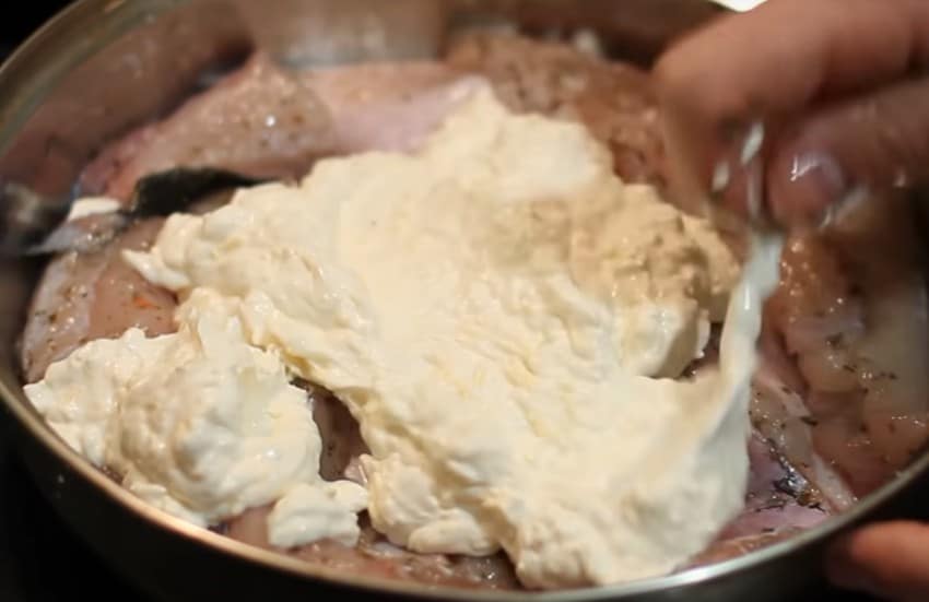 - Сметану перемешайте со щепоткой соли. Намажьте ею толстолобика.