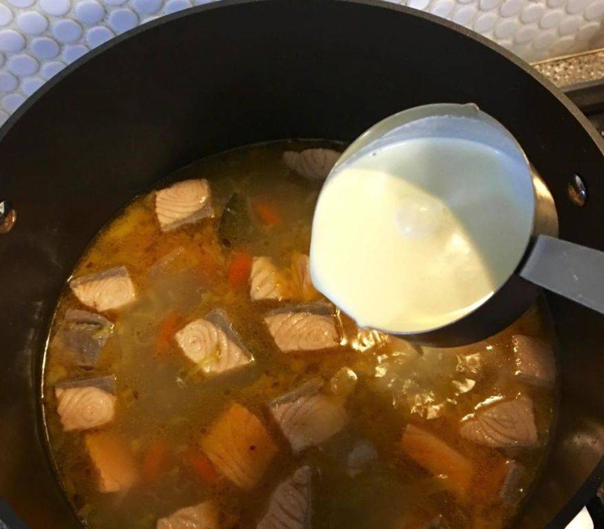- В закипевшую воду всыпьте картофель и проварите его 20 мин. Положите рыбу, влейте сливки. Держите на плите еще 10 мин.