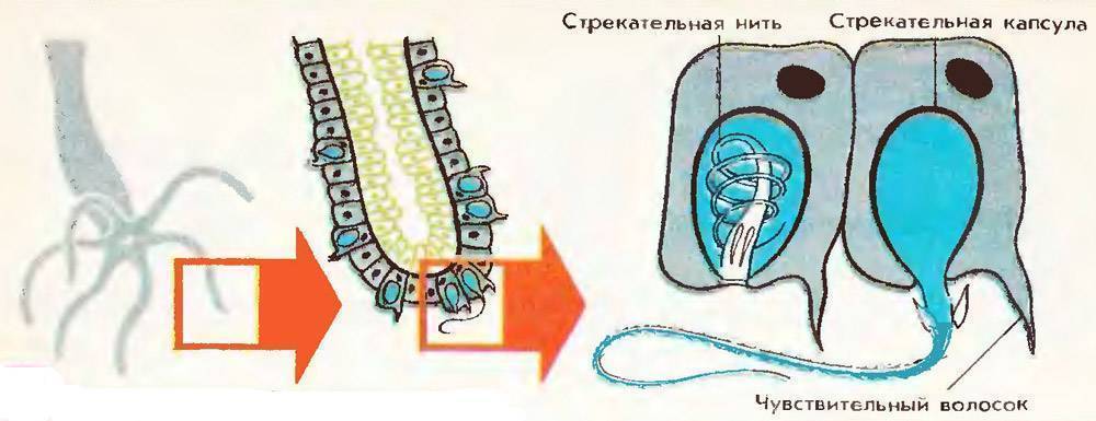 У каждой такой клетки имеется книдоциль – наружный вырост, при соприкосновении мелких животных с которым активируется стрекательная клетка: шипы пронзают добычу, а стрекательная нить, высвобождающаяся из капсулы клетки, впрыскивает в ткани жертвы нейротоксин – добыча оказывается парализованной.