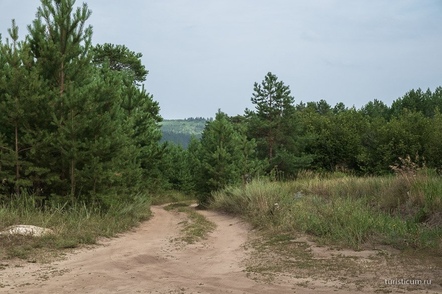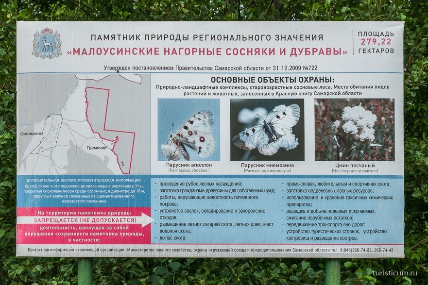На перекрестке нам нужно свернуть налево, следующая развилка — снова налево, следующая — направо и потом уже выезжаем на последнюю развилку. Если на ней повернуть направо, то попадем в поселок Гремячий, круто налево – дорога ведущая обратно к Смолькино через березовую посадку, а чуть правее и прямо — выезжаем к полянке перед бродом через реку Уса. На этой полянке нам и надо остановиться. На ней же стоит знак оповещающий нас о том, что мы на территории памятника природы «Малоусинские нагорные сосняки и дубравы».