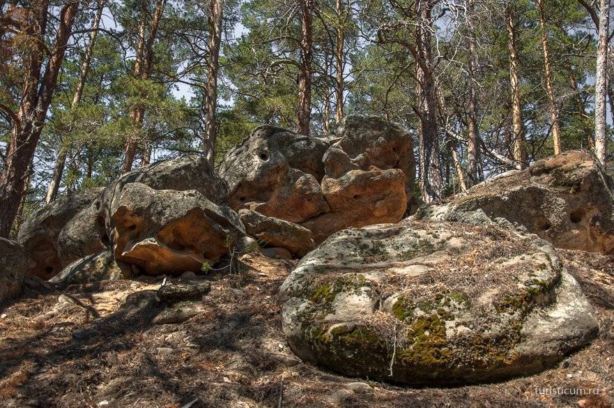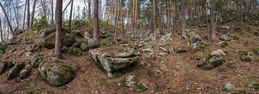 Кратко можно повторить, что все валуны и камни всевозможных форм, которые мы видим на склонах, состоят из породы сливного песчаника палеогенового периода. Формирование сливных песчаников происходило на протяжении около 40 млн лет. За это время древнее море то приходило, то уходило три раза. Потом произошло поднятие некоторых участков (как раз один из них — то самое высокое плато с высотами 280-320 м). И на протяжении оставшихся 20 млн лет различные виды эрозии обнажали склоны этих гористых участков, доводя до текущего состояния, до той каменной красоты, что мы видим сейчас. Эти процессы не останавливаются и по сей день. Итого от начала формирования пород и до наших дней — 60 миллионов лет.