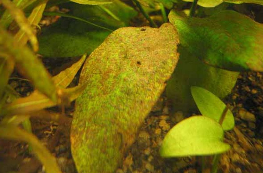 При недостатке меди в воде аквариума бледнеет вся листовая пластинка, отмирают мягкие ткани листа. Медь в аквариум можно вносить в виде медного купороса (0,2 мг на 1 л воды).