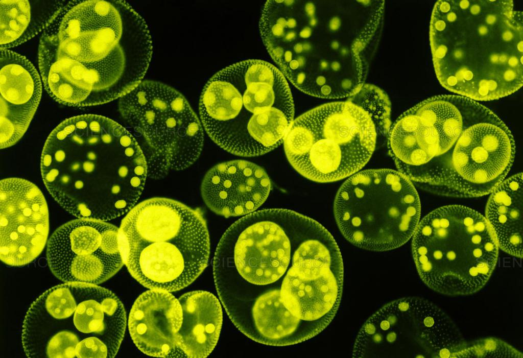 Колония вольвокса выглядит как зеленый шар размером максимум 3 мм. В каждый из таких шаров входит от 10 до 200 тысяч микроскопических клеток, которые соединяются нитками из протоплазмы. Как и у хламидомонады, у них имеются жгутики для передвижения внутри водоема. Клетки не одинаковы и разделяются по своей специфике. Одни являются вегетативными, другие генеративными и принимают участие в половом размножении.