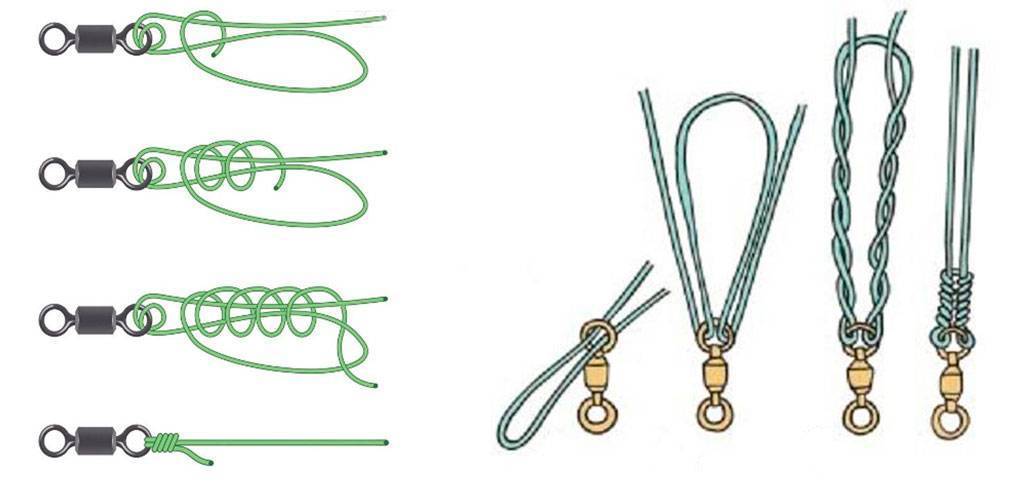 Существует достаточно большое количество способов, как можно прикрепить карабин к леске, все они подразделяются на 2 вида: