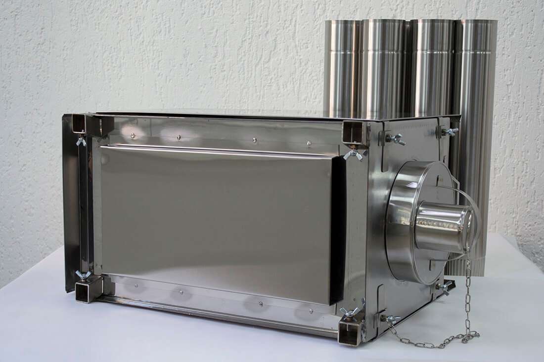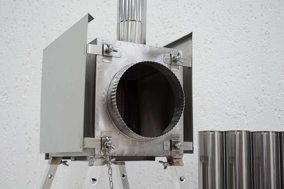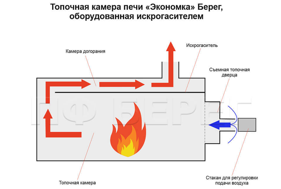 Обязательный элемент, входящий в конструкцию всех моделей духовок «Берег», — искрогаситель. Оснащение шатровых топок искрогасителем повышает защиту от возгорания наружного навеса и гарантирует продолжительность горения на дровяной доске 6-9 часов. Это время горения также доступно для мини-печей-палаток.