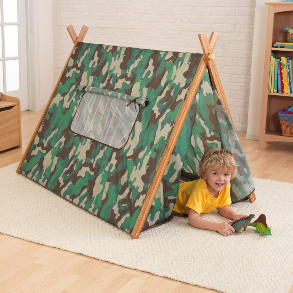 Для того чтобы сшить детскую игровую палатку потребуются 4 высоких деревянных бруска, отрез ткани, дрель, перекладина и резинки. 4 бруска выступают в роли основания, по 2 с каждой стороны. Скрещивая их, в месте пересечения делают отверстие при помощи дрели. В отверстия устанавливается перекладина, которая будет соединять две стороны.